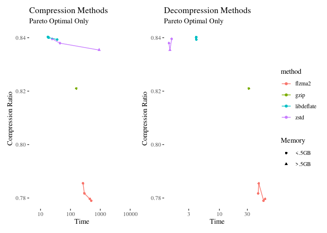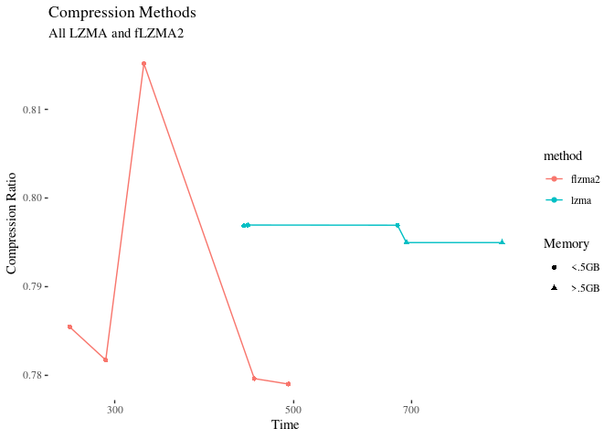 In general, it is the compression benchmarks that seem to vary the most. Decompression is not much over 30 seconds even for the most time intensive method. flzma2 is a clear winner in these trials, with about 4% more compression than gzip. Flzma2 is not commonly available, and it would be best if we could use something less obscure. It is a fast implementation of LZMA, which is available in the package xz, so let’s compare those: