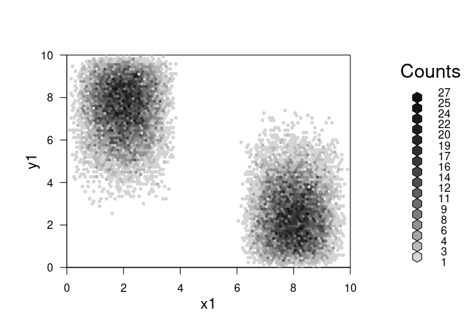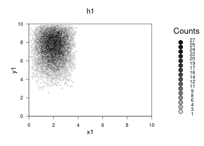 ## 'hexbin' object from call: hexbin(x = x1, y = y1, xbins = 100, shape = 0.75, xbnds = c(0, 10), ybnds = c(0, 10))