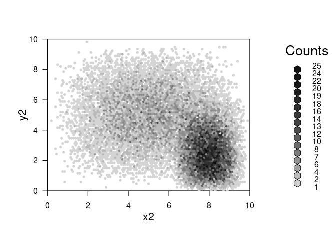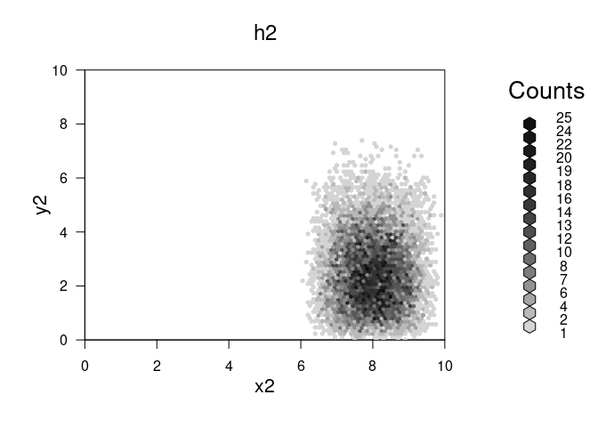 ## 'hexbin' object from call: hexbin(x = x2, y = y2, xbins = 100, shape = 0.75, xbnds = c(0, 10), ybnds = c(0, 10))