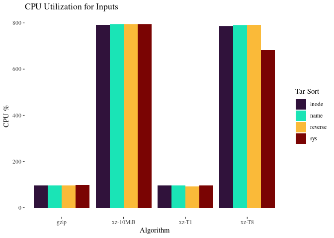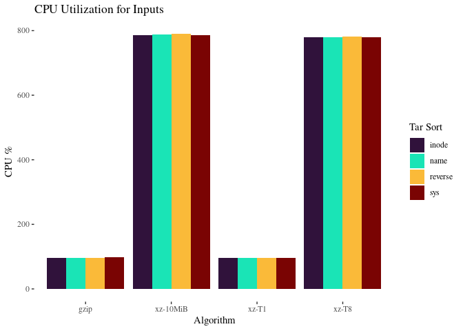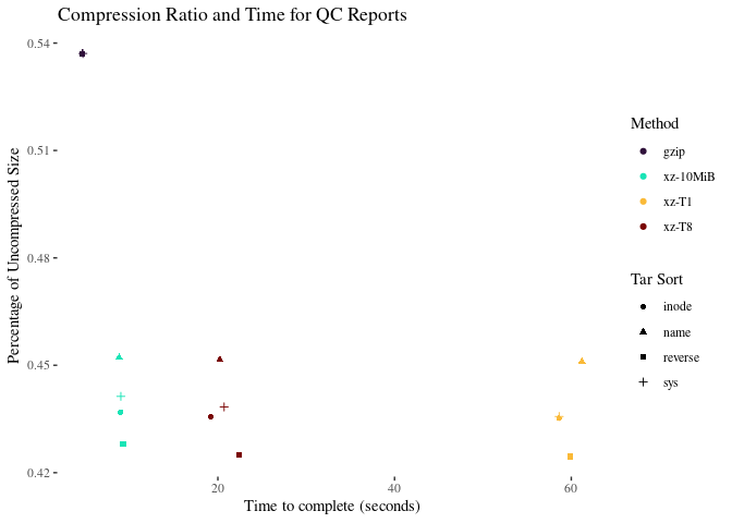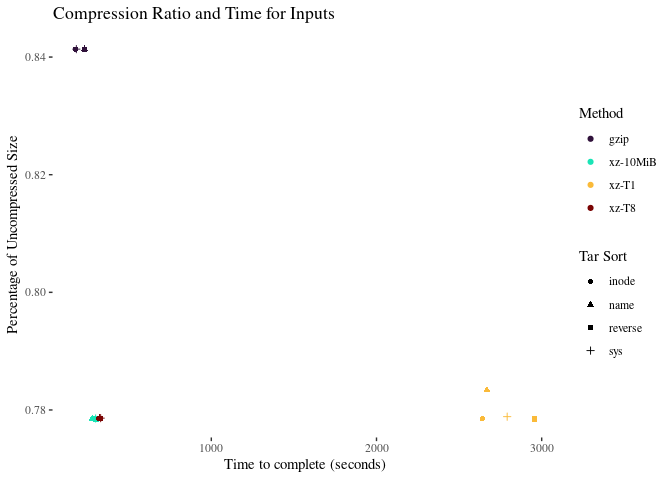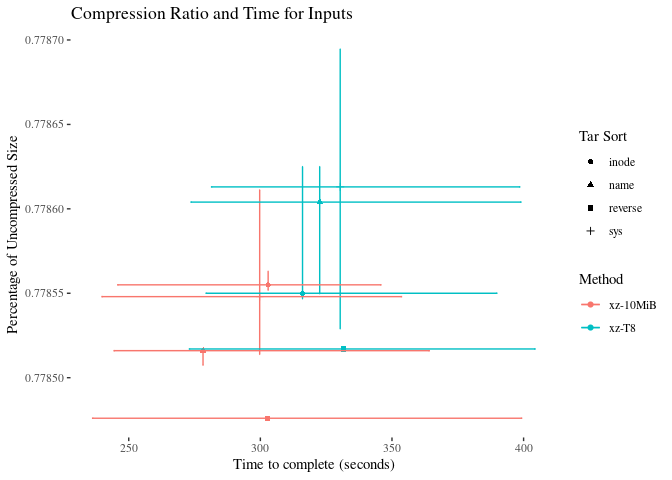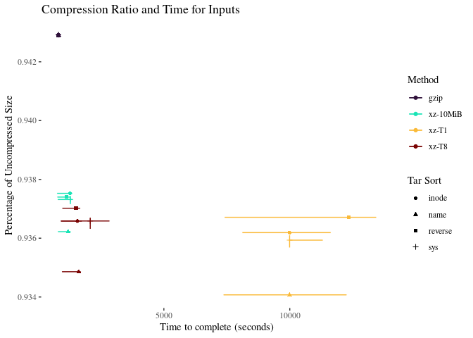 Iāve omitted error bars when they are unhelpful. One interesting note is that some variability in compression occurs if you let the system sort the files for tar.