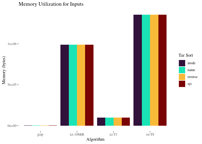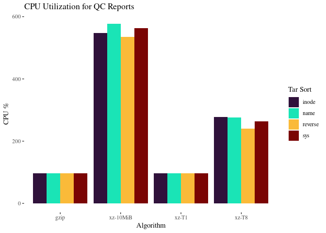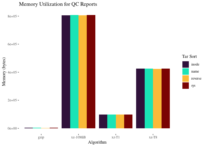 Sorting: I want to test a variety of sorting methods. In theory, we might get better compression if files that have similar patterns of data (e.g., event files) are compressed sequentially instead of interspersed amongst other types of files (e.g., images). This is controlled by the tar command, which globs all the files together before they are compressed. If the order is different, you can get different results ā this can create differences in file size created by, for example, different versions of tar. Here are the different methods: * System: the default, just compress things in the order the system lists them. This may differ across run and system type. * Name: Sort alphabetically by name * Inode: Sort by position of the file on disk * Reverse: Reverse the filename like you were making a palindrome, then sort alphabetically by that list. Effectively, this sorts by file type given the file extensions present in BIDS. Tar canāt do this natively, you have to use a filelist, like so:
